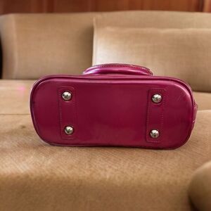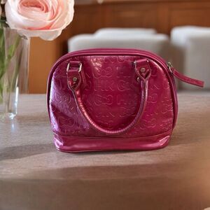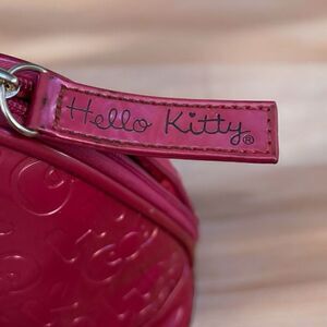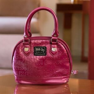 Look adorably sweet with your Hello Kitty mini bag! This shiny, fuchsia, faux leather bag features all over embossed Hello Kitties & bows, removable pink bow, Hello Kitty silver hardware, zip top & black lining.