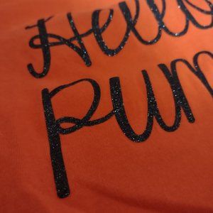 In excellent condition. Never worn (tags removed), but a little wrinkled from storage. 19" across the front. "Hello Pumpkin" is in black glittery text on a bright orange tee. I will ship ASAP (usually within a day or two).