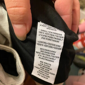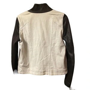 Pre owned like new. This is a really cute unique jacket. The front and back are a super light wash denim and the sleeves are a contrast black sleeve that have a faux leather/coated feel. The size has been removed but I believe this is a medium. Measurements below