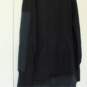 • the sweater had a hood on it (which honestly made it kind of ugly) so my husband cut it off😂 you can only tell that it was cut off from the inside, outside of the collar there is no trace of that! In the process the size tag was also cut which was a medium. See measurements below!