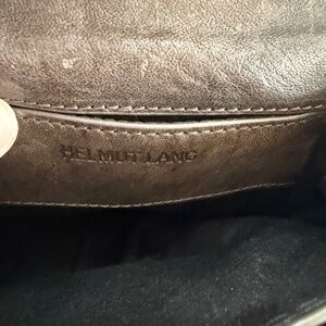 Gray distressed leather Helmut Lang Nysa bag with gunmetal hardware, single chain-link shoulder strap, metal panel at base, black woven lining, single slit pocket at interior wall and magnetic closure at front flap. Minimal wear, is INTENTIONALLY distressed and is in great condition.