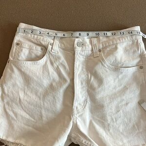 Stylish off white denim shorts. Features frayed hem. Perfect for casual wear.