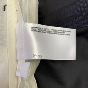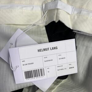 HELMUT LANG by PETER DO SS24 suit in a black virgin wool with a full liner and includes a single breasted, double button sport coat with a notch lapel and matching flat front trousers. Design features black seatbelt tuxedo stripes on the trousers, and wrap around seatbelt with button closure on sport coat.