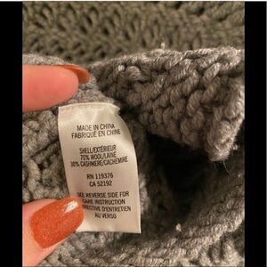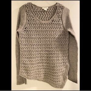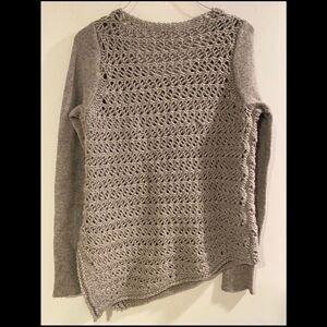 Crewneck / Long sleeves in purl knit / Chunky open knit for body / Vent on right side with rib trim / Angled hem / Relaxed fit / Color: Light Grey / 70% Merinio 30% Cashmere.