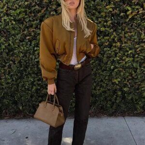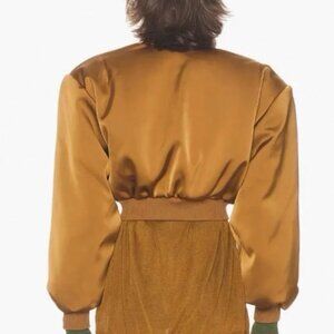 Luxurious satin bomber jacket in a striking gold shade. Perfect for adding elegance to any look.