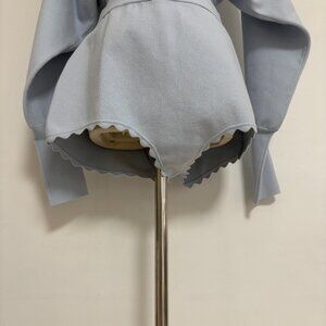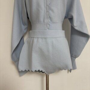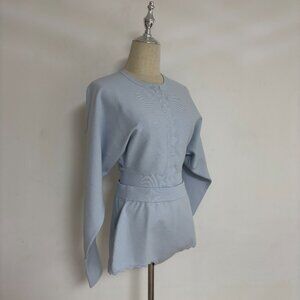 This ribbed knit cardigan features long sleeves, a fitted waist, and fan-shaped piping. It has snap buttons at the front. Please note that this item is not sold separately.