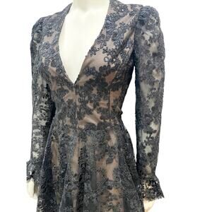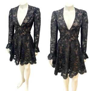 This sparkling mini captivates with its plunging neckline, scalloped skater skirt and sheer sleeves set with puff shoulders and ruffle cuffs. 34" Length ( Size M) Double Lined Latinx Owned/Founded 100% polyester Hand wash, dry flat Made in the USA or imported