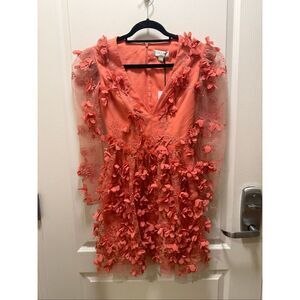 HELSI Sidney Long Sleeve Floral Minidress in Coral Cocktail Party Size XS NWT Laser-cut floral tulle overlay Deep V-neckline Long sleeves Soft lining (except for sleeves) Length: 34 1/2 in Perfect for cocktail parties, weddings, vacations, or summer events.