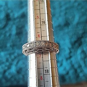 This limited edition diamond band from the "Bondanza Collection" at Helzberg Diamonds is a stunner! 10 brilliant cut diamonds across the raised top w/ additional pave diamonds set into the scroll work. Approx. 1 ctw in diamonds. 14K white gold. Size 6.5. Gently worn. THIS PRICE IS FIRM.