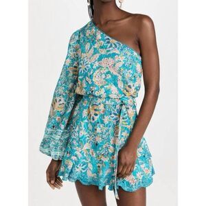 HEMANT AND NANDITA Lyna Short Floral One-Shoulder Dress in Turquoise Small NWT