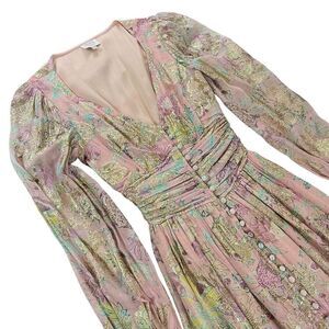 Self: 81.2% viscose, 18.8% metallized fiberLining: 100% viscose. Made in India. Dry clean only. Fully lined. Front loop button closures. Buttoned cuffs and pleated detail at waist. Metallic gold appliques throughout. Lightweight fabric with embroidered hem. Our Style No. BENF-WD50. Manufacturer Style No. HN-NORA-5256.