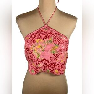 HEMANT AND NANDITA Pakhi Crop Top in Pink Self: 100% cotton Lining: 100% polyester. Made in India. Dry clean only. Back clasp closure. Halterneck tie closure. Crochet fabric overlay.