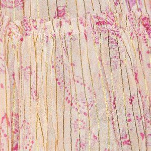 Semi-sheer crepe de chine fabric with metallic gold striping throughout and embroidered hem