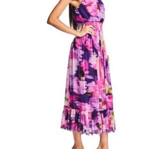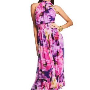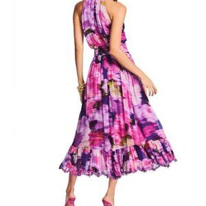 The delicate draping and texture of the viscose crinkled chiffon lends an air of effortless glamor to this classic style. Dipped in multi-colored eye catching hues of purple and pink, the dress features a button closure, a flattering halter neck and and gently curves and hugs around the waist for that comfortable yet contoured fit.
