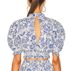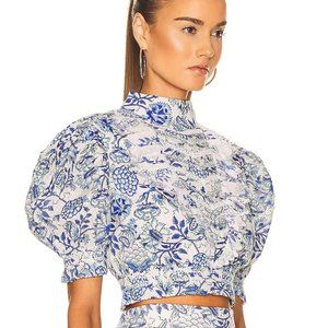 Elegant crop top with blue floral design. Features puff sleeves and high neckline. Perfect for stylish outings.