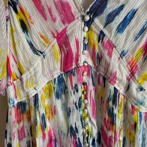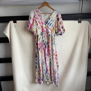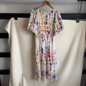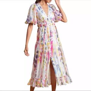 Chic midi dress with vibrant brushstroke pattern. Features a V-neck and puff sleeves. Elegant front slit and ruffled hem.