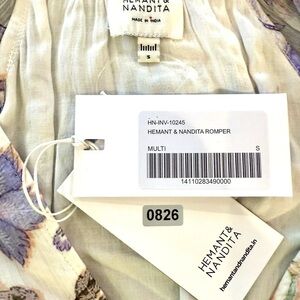 Stunning Hemnat & Nandita romper, perfect for spring, summer & fall! Braided belt features gold seashells. Scalloped trim, fully lined. Fabric covered buttons. Stunning!