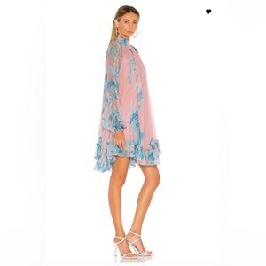 Chic mini dress with floral patterns. Features a high neck and long sheer sleeves. Ruffled hem adds elegance.