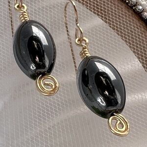 Oval Hematite beads wrapped in gold plated wire with hammered spirals