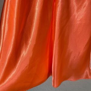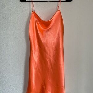 Vibrant orange satin slip dress with a sleek design. Perfect for a night out.