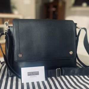 HENRI BENDEL Bowery Flap Black Leather Crossbody Messenger Shoulder Bag Large. Excellent condition from smoke and pet free home. Can be worn front or back facing as even on back there is HB logo. Large rear pocket is amazing! 4 interior pockets. Lovely luxe satin lining with HB logo. Minor scuff on front. Edge coating on shoulder pad has come loose in one small spot as pic shows. This bag sits perfectly on your body- not bulky but slim silhouette