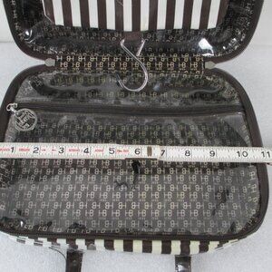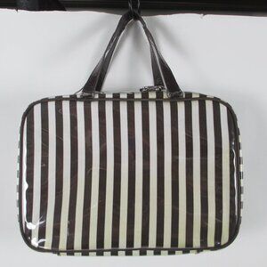 Two large zippered compartments in see-thru vinyl, plus attached striped zippered pouch.