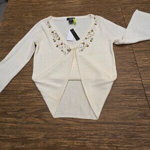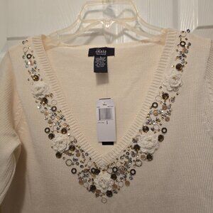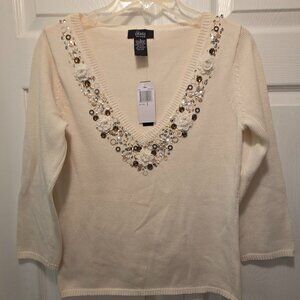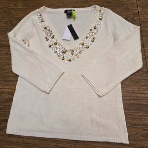 HENRY NEW YORK Women's 100% Cotton V-Neckline Beaded L/Sleeves Sweater - SML