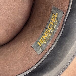 Suede cowhide leather, raw edge on the brim and a hand braided band. Small blemish on the top of the crown (see pictures), otherwise excellent condition. Size large. Measures 2.75” Brim, 21” around interior of crown.