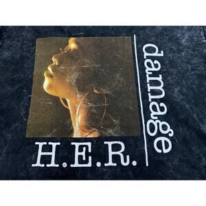 Official H.E.R. tour merch long sleeve shirt featuring artwork and credits from the song “Damage.” Black cotton base with vertical “damage” print, profile graphic, and “H.E.R.” text on front. Back features full lyric/credit print for Vol. 1&2. Tagged size XL.