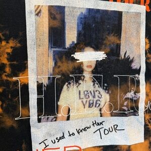 Keywords: H.E.R. T-shirt, multicolor tee, graphic print, music theme, concert wear, unisex clothing, classic fit, short sleeve, tie-dye, distressed style, casual wear, cotton shirt, crew neck, machine washable, pre-owned.