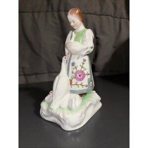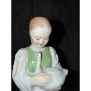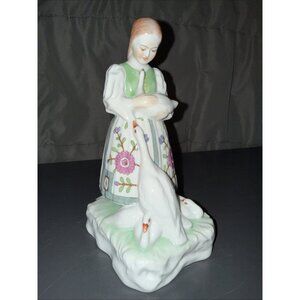 HEREND Peasant Girl With Geese Green Dress 8" Tall Porcelain