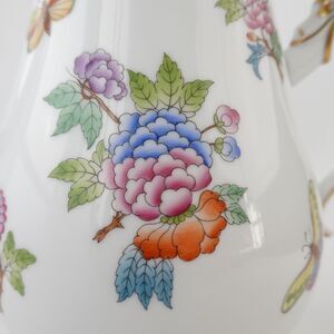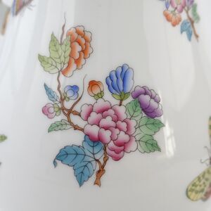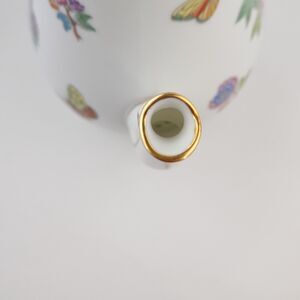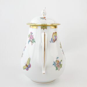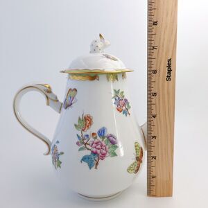 HEREND Queen Victoria Individual Coffee Pot with Bunny Finial #3412, Rare. This exquisite coffee pot is painted in the Queen Victoria pattern and is signed on the bottom. Although one bunny's ear is chipped, it remains a charming and unique piece. Otherwise, it has no other chips or cracks and is in good pre-owned condition.