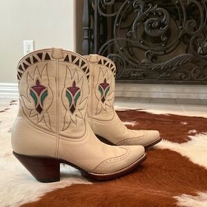 These boots are gorgeous!! They were originally sold as wedding boots from the famous boot store in Austin. Hand tooled inlay coexist with opulent white calfskin. Riding layered leather heel and pointed toe make these beauties a classic! Size 6.5 and a bit narrow. Originally sold $795
