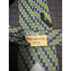 This vintage HERMES 100% silk tie in green and blue features a geometric pattern, making it a stylish and luxurious addition to any man's wardrobe. The designer brand and high-quality material ensure a sophisticated and timeless look, perfect for formal or professional occasions. The classic color combination and intricate design make this tie a versatile and eye-catching accessory for those who appreciate fine craftsmanship and attention to detail. In good condition, tag on the back is detached from one side, but can be seen back. As this tie is vintage there may be some additional signs of wear.