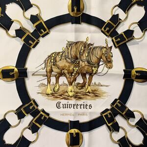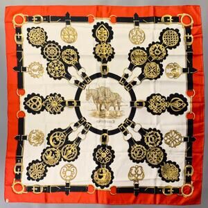 HERMES 1963 Cuivreris Red Gold White Black Horses Silk Twill Scarf