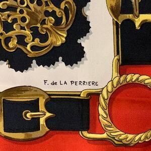HERMES 1963 "Cuivreris" scarf in a red, gold, white, and black silk twill featuring a horses print with ornate gold buckles, and red picture frame border. Designed by F. de LA PERRIERE. Made in France.