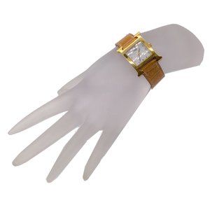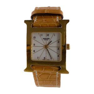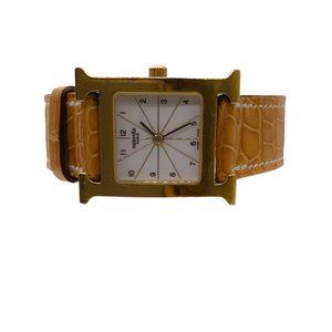 Description: Hermes Tan / Gold Plated Stainless Steel Crocodile Skin Leather 21mm Heure H Watch from the 2004 collection.