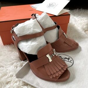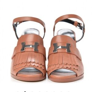 HERMES ALESIA GOATSKIN SANDALS in Rose Bubinga which is a Camel color. sz 38. Super comfy block heel sandals with silver H emblem. Very gently worn. Comes with box and dust bag. Purchased in Hermes Store.