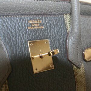 This exceptional Birkin 35 Club made of Taurillon Clemence Calf skin leather with a smooth L*zard skin and Permabrass Hardware.
