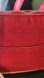 Elegant red canvas bag with cream leather trim. Features a stylish scarf detail. Ideal for everyday use.