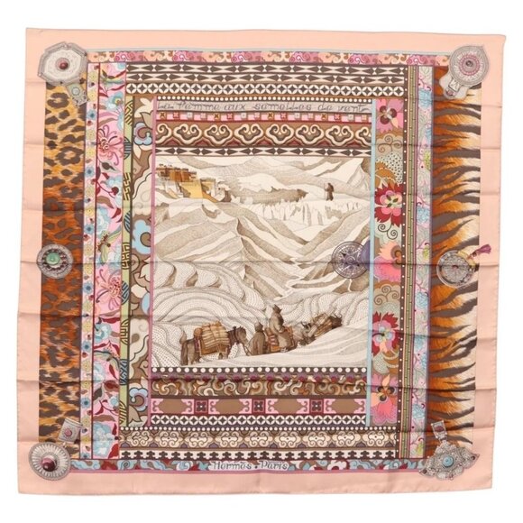 HERMES Carre 90 Scarf LA FEMME AUX SEMELLES DE VENT Silk Pink Auth am9373
