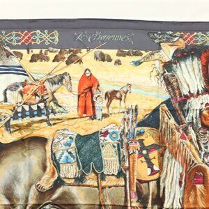 HERMES Carre 90 Scarf ""Les Cheyennes"" Silk Brown