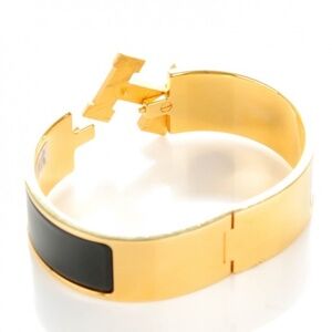 This is an authentic HERMES Enamel Wide Clic Clac H Bracelet GM in Noir Black. This is a chic bracelet from Hermes that is classic yet very modern. It is a gold band with a hinge on one side that opens with a swivel Hermes "H" on the prominent side. Around the band is a strip of black enamel. This band can be worn to add sophistication to casual attire or be worn to compliment more formal wear with the classical sophistication of Hermes!