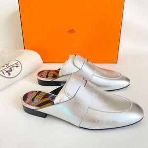 100% Authentic HERMES CATENA SILVER LEATHER MULES!!!