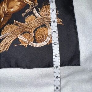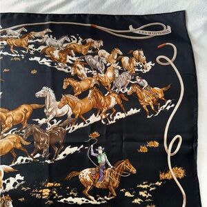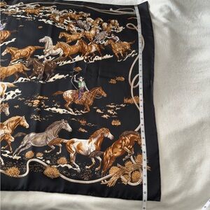 This HERMÈS “Les Mustangs” Silk Scarf designed by Robert Dallet is simply a Wearable Work of ART! It is approximately 34” x 34” square (See Photos) with some variations due to the hand-rolled edges. I have been collecting Hermès Scarves for 30 years, and I simply never wore this because it is a breathtaking masterpiece, in my opinion. You can see Robert Dallet’s signature in the lower right corner of the scarf, and the Hermès copyright is in the rope design along the upper left quadrant of the scarf (See photos). I purchased this from their NYC store a while back & am the first and only owner. It is New Without Tags - I did remove the sales & care tags as I had taken this on a trip and had planned to wear it. (It is silk and should only be dry cleaned.) I hope that you enjoy and cherish this beauty!