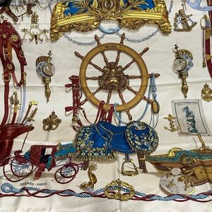 Elevate your style with Hermes luxurious Hermès "Musée" silk scarf. Featuring elegant cream and gold tones, it's a perfect accessory for any occasion. Please look at pictures as part of description and ask questions.
