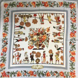 Description: Hermes Paris Grey Multi Vintage Les Jardiniers du Roy Printed Square Silk Scarf with hand rolled edges. Designed by Maurice Tranchant, this scarf was first issued in 1967 and reissued in 1982.