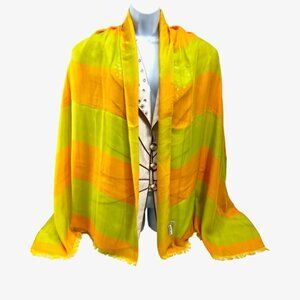 HERMES ParisLightGreen Orange Chiffon silk Scarf 70"x2 8 Logo H PrintFringe(34