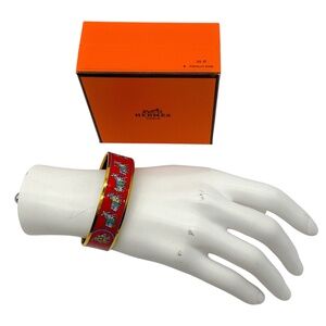 Hermes Red Multi Horse and Elephant Print Enamel Wide Bangle Bracelet