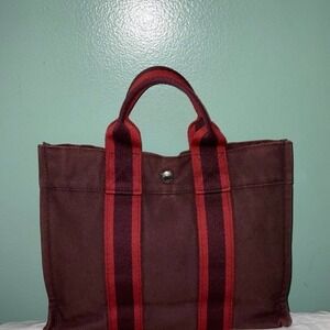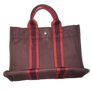 HERMÈS Hermes Canvas Bag Fourre Tout Small Stripe Burgundy Maroon Tote Bag Purse